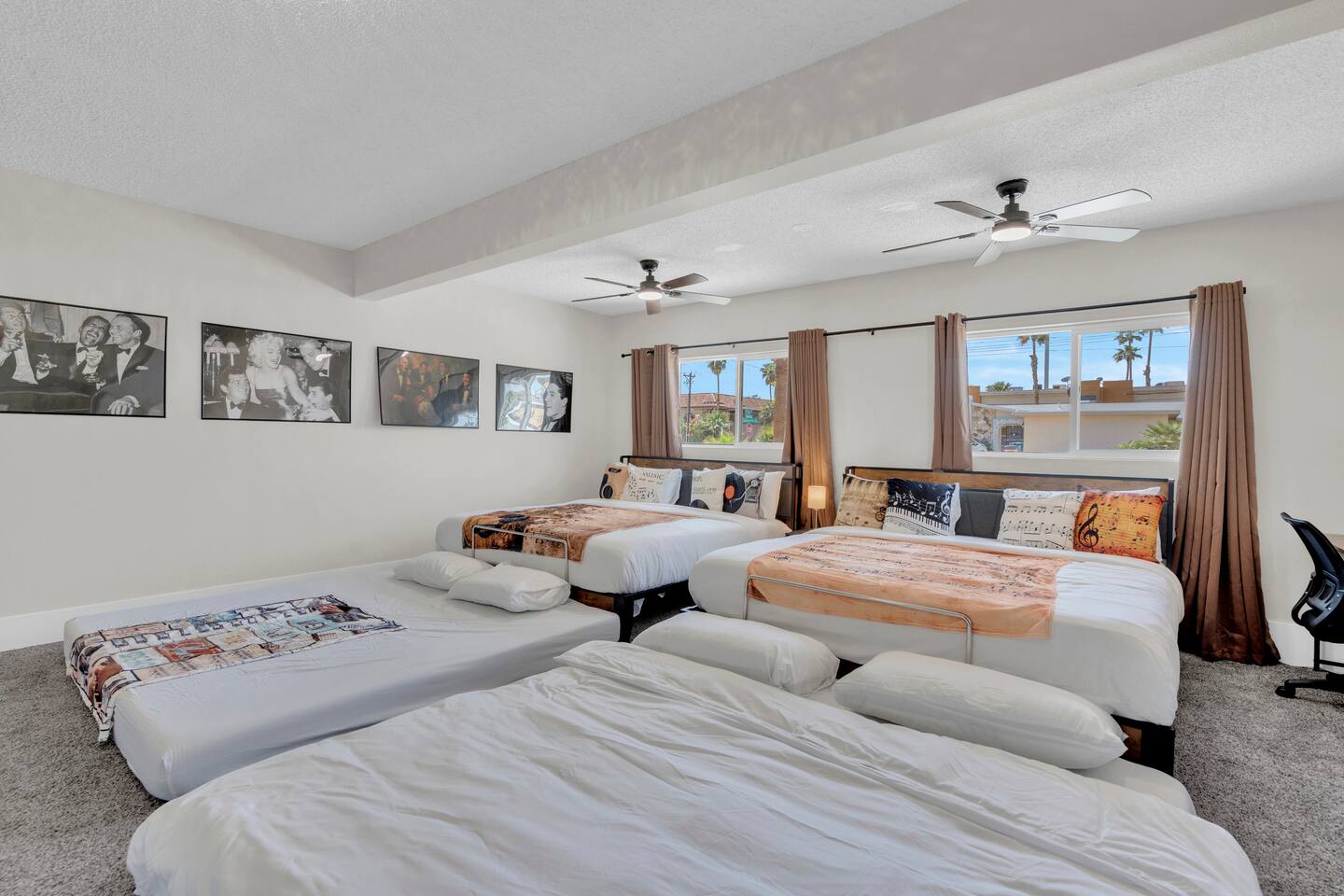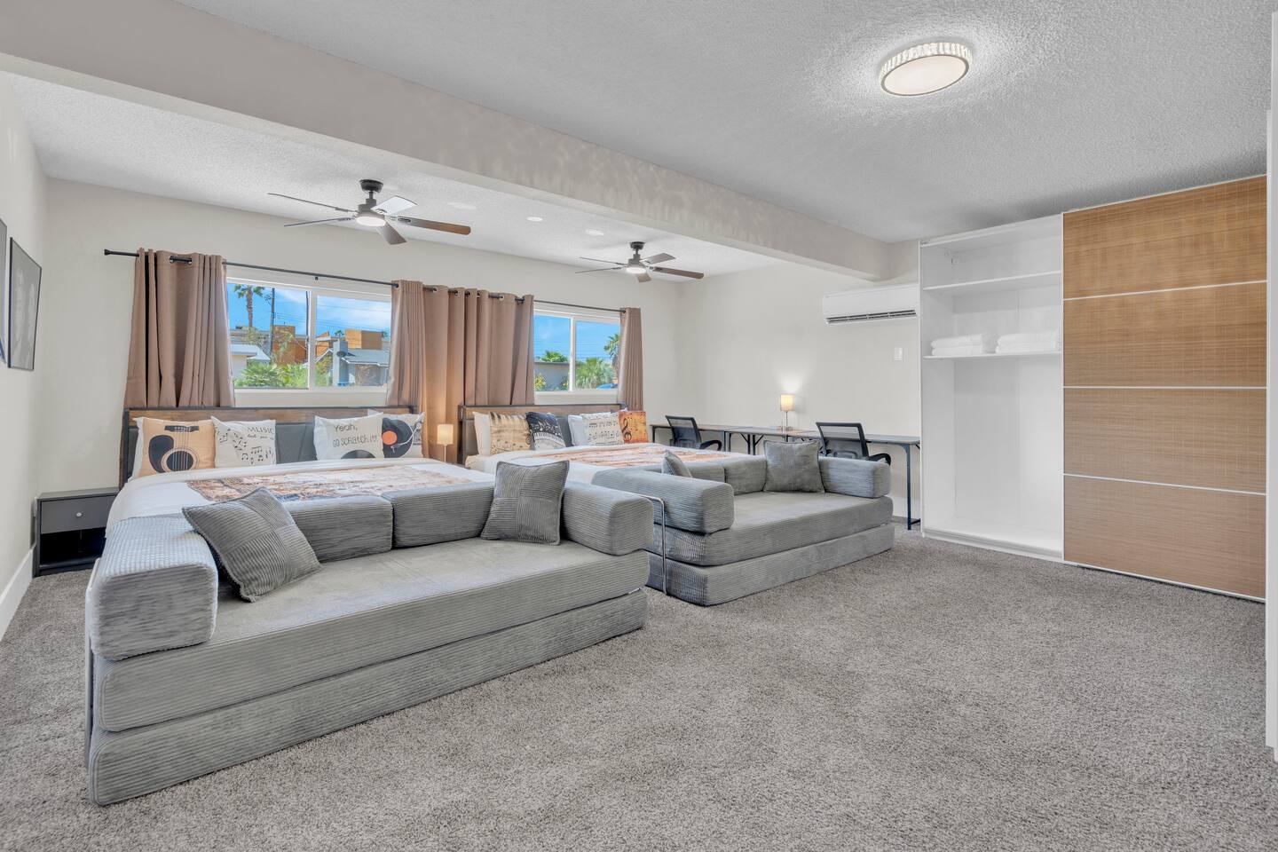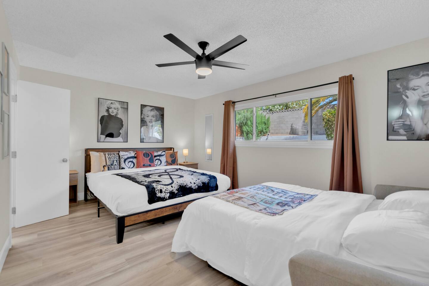 Step into the rhythm of Vegas history at this iconic mid-century home once owned by legendary drummer Buddy Rich. Just minutes from the Strip, this retro retreat features themed rooms honoring Elvis, Sinatra, and Marilyn Monroe. Unwind in the pool, hot tub, or enjoy a backyard BBQ. With a musical memorabilia, it's a nostalgic escape in the heart of Las Vegas.