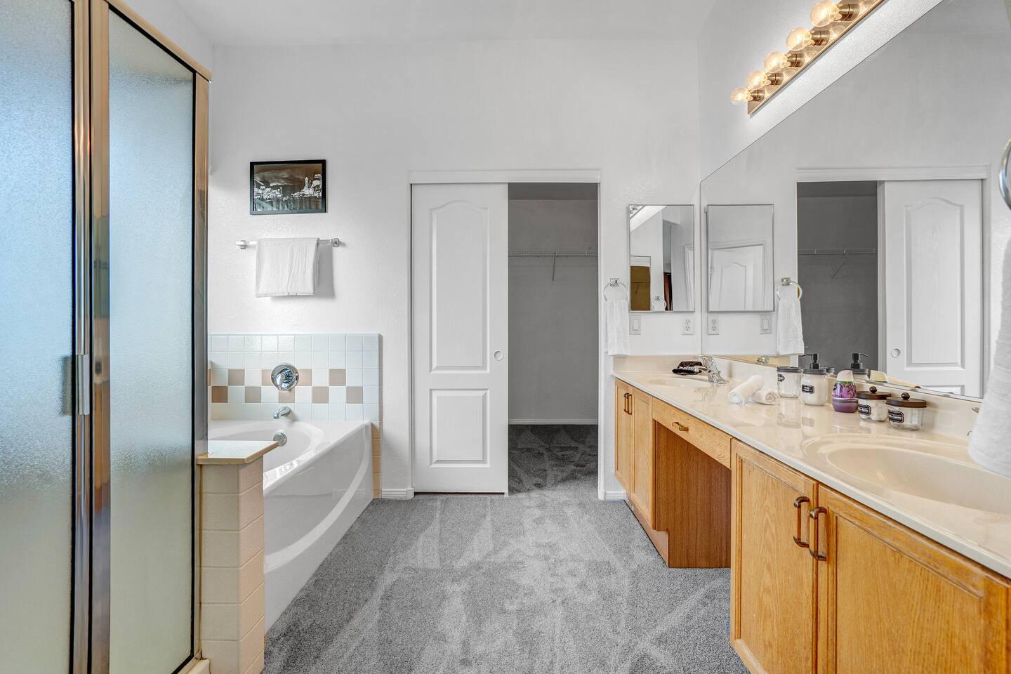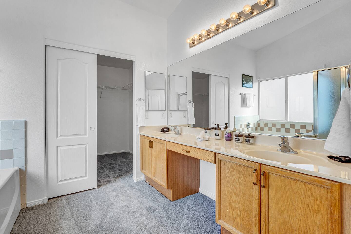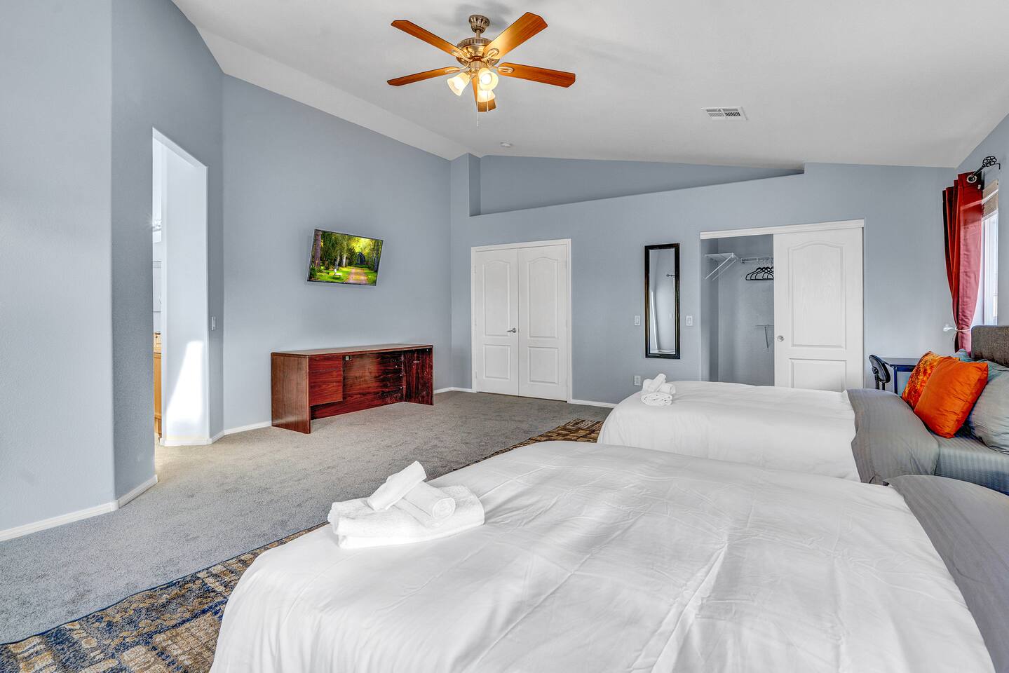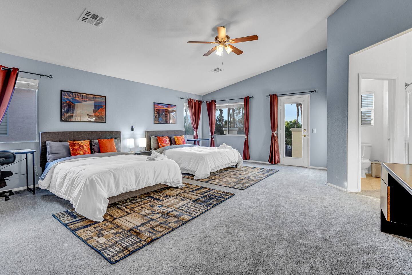 Welcome to the Grande Master Bedroom, your perfect retreat for comfort and convenience! This spacious room features two queen beds, a private ensuite bathroom, a walk-in closet, and a balcony offering a serene space to unwind. Enjoy access to shared areas, including a fully equipped kitchen, cozy living room, pool table, outdoor dining, backyard, swing, BBQ, and laundry. Ideal for residents, traveling nurses, professionals, house hunters, or residents seeking a comfortable stay. Great Location!